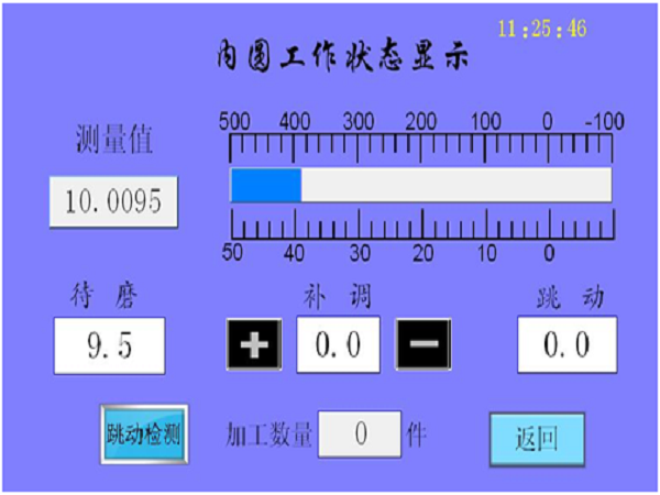 当各种数值都设定好后,在“加工中操作面板”点击“启动”按钮,便进入自动测量状态(仪器上电时自动进入)。外径与内径对应不同的工作状态显示界面,分别如下图所示: